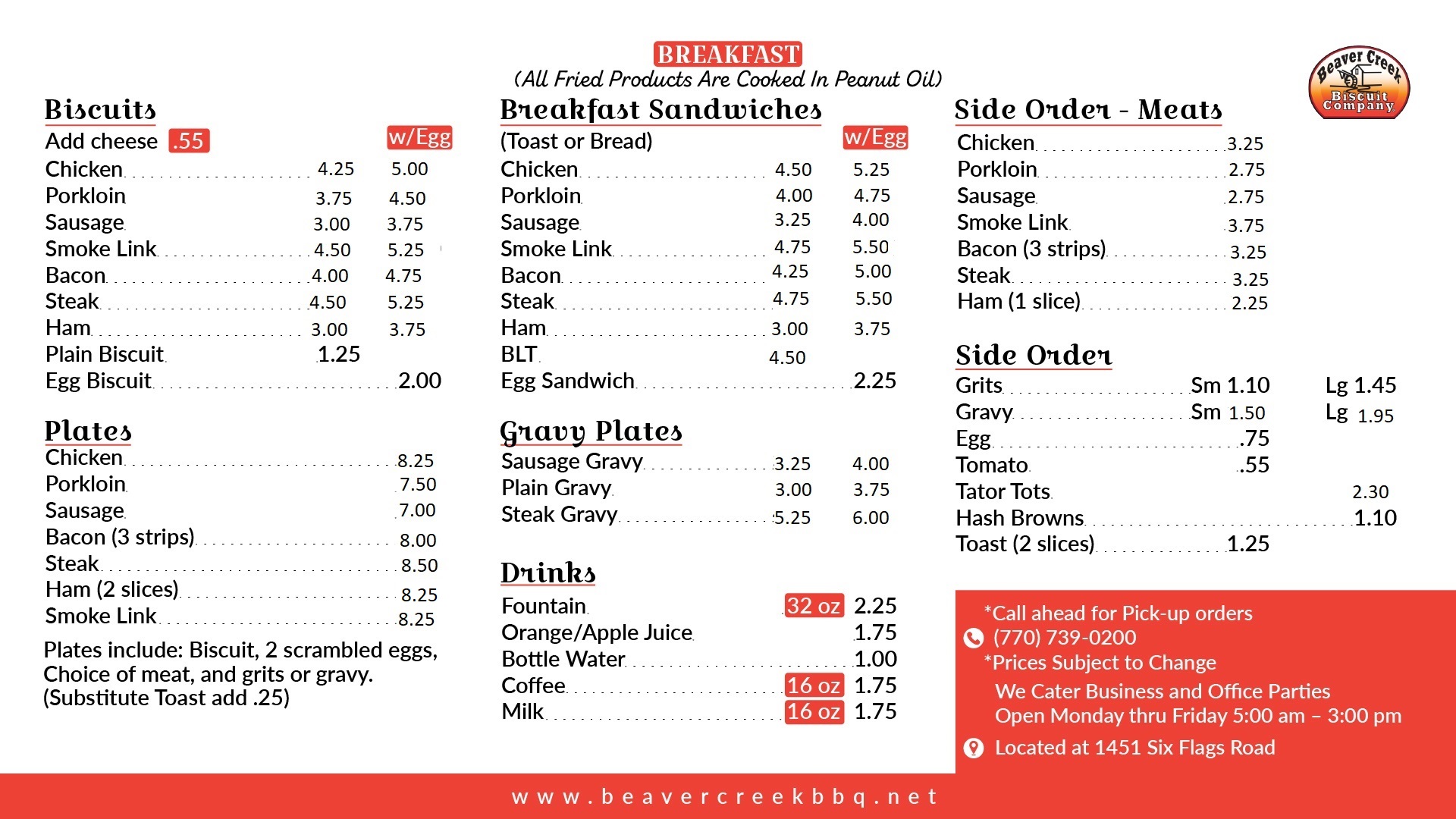 Monday thru Friday 5:30 am - 3:00 pm Saturday CLOSED